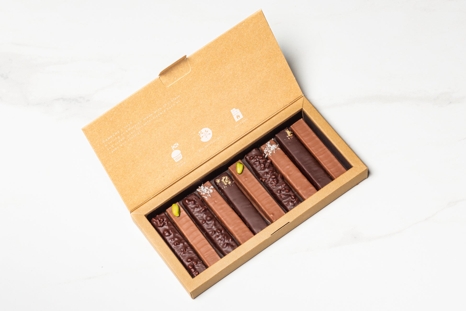 A blend of almond and hazelnut praline and chopped toasted nuts coated in dark chocolate.